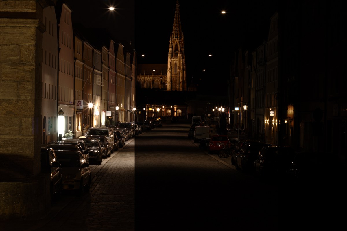 Beleuchtungsstärke wäre deshalb das Abbild der langen Brennweite dunkler, als das der kurzen