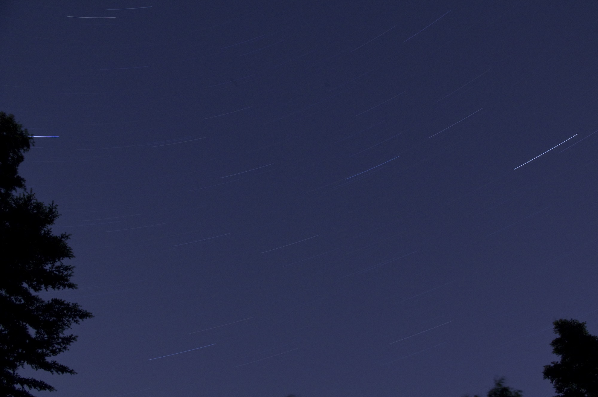 Gemacht hab ich (bei offener Blende, daher leicht unscharf) 50 Bilder, je 30sek belichtet. Gesamt also 25 Minuten belichtet. Beim ersten hab ich die Bilder gleich averaged, das führt dazu, dass die Sterne hübsche Streifen ziehen. Man sieht auch deutlich die Sensorfehler(helle, stationäre Punkte); ich hab vergessen, einen Darkframe zu machen und den immer abzuziehen. Auch das ein- oder andere Flugzeug lässt sich entdecken.