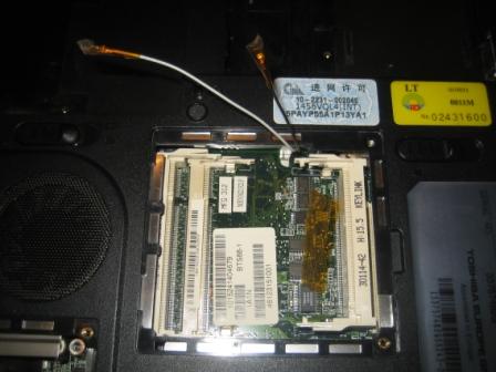 zu deinem eigendlichen Problem kann ich dir nicht wirklich helfen, diese Kabel dort allerdings sind nichts weiter als die beiden Antennenkabel für eine WLAN-Karte (die man in den miniPCI-Steckplatz einsetzen würde der bei dir gerade leer ist). Sie haben mit deinem Problem also nichts zu tun.