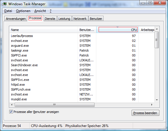 Das Häckchen für die Benutzer ist da. Es sind trotzdem nur ca. 40-50 Prozesse. Die CPU Auslastung geht bei manchen Prozessen immer wieder auf 02 oder 05 der Leerlauf hat meisten 99.