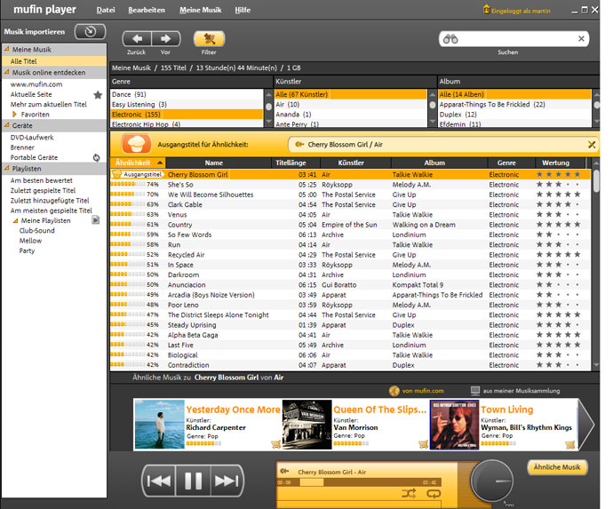 Das Fraunhofer-Institut hat einen Algorithmus entwickelt, mit dessen Hilfe ein aktuelles Musik-Stück analysiert und anderen Liedern verglichen wird. Dadurch ist es möglich, ähnliche Titel mit demselben Musikstil ausfindig zu machen. Das Softwareunternehmen Magix hat nun den Mediaplayer mufin veröffentlicht, der auf diesen Algorithmus aufbaut. Somit ist der Player für Anwender interessant, die auf der Suche nach weiteren stilistisch ähnlichen Musiktiteln sind.
