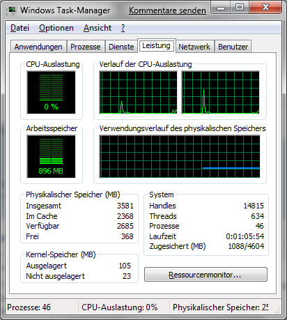 da waren wohl noch von anderen programmen reste im arbeitsspeicher gecached, die entweder dann gelöscht, oder in die auslagerungsdatei verschoben wurden. also wenn ihr euch mal die screenshots von mir anguckt, ist die arbeitsspeicher-auslastung vollkommen in ordnung.