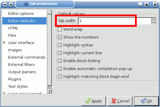 wie lautet der Standard für das Einrücken mittels Tab? Ich habe das Problem, dass unterschiedliche Programme das Einrücken unterschiedlich machen. Meines Wissens nach mal mit einem "richtigen" Tab, dann mit vier Leerzeichen, usw. Daraus resultiert, dass der Quellcode dann teilweise verrückt wird.