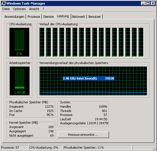 Ich wollte Euch nur mal kurz zeigen, wie pompös sich ein aktueller Serverprozessor wie der Intel Xeon E5530 im Windows Taskmanager zeigt. 8 physikalische Kerne ergeben in Verbindung mit Hyperthreading insgesamt 16 logische Kerne.