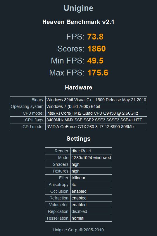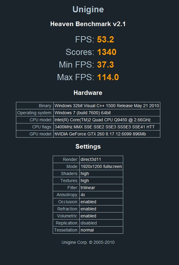 So ich habe für dich gerade auch mal Unigine Heaven 2.1 getestet. Dort kann man allerdings alles verstellen, ich habe erstmal alle werte so gelassen wie sie nach der Installation waren. man bekommt eine html Datei heraus, im Anhang ein Screenshot davon. Allerdings stimmen da bei mir wieder einige Werte nicht.
