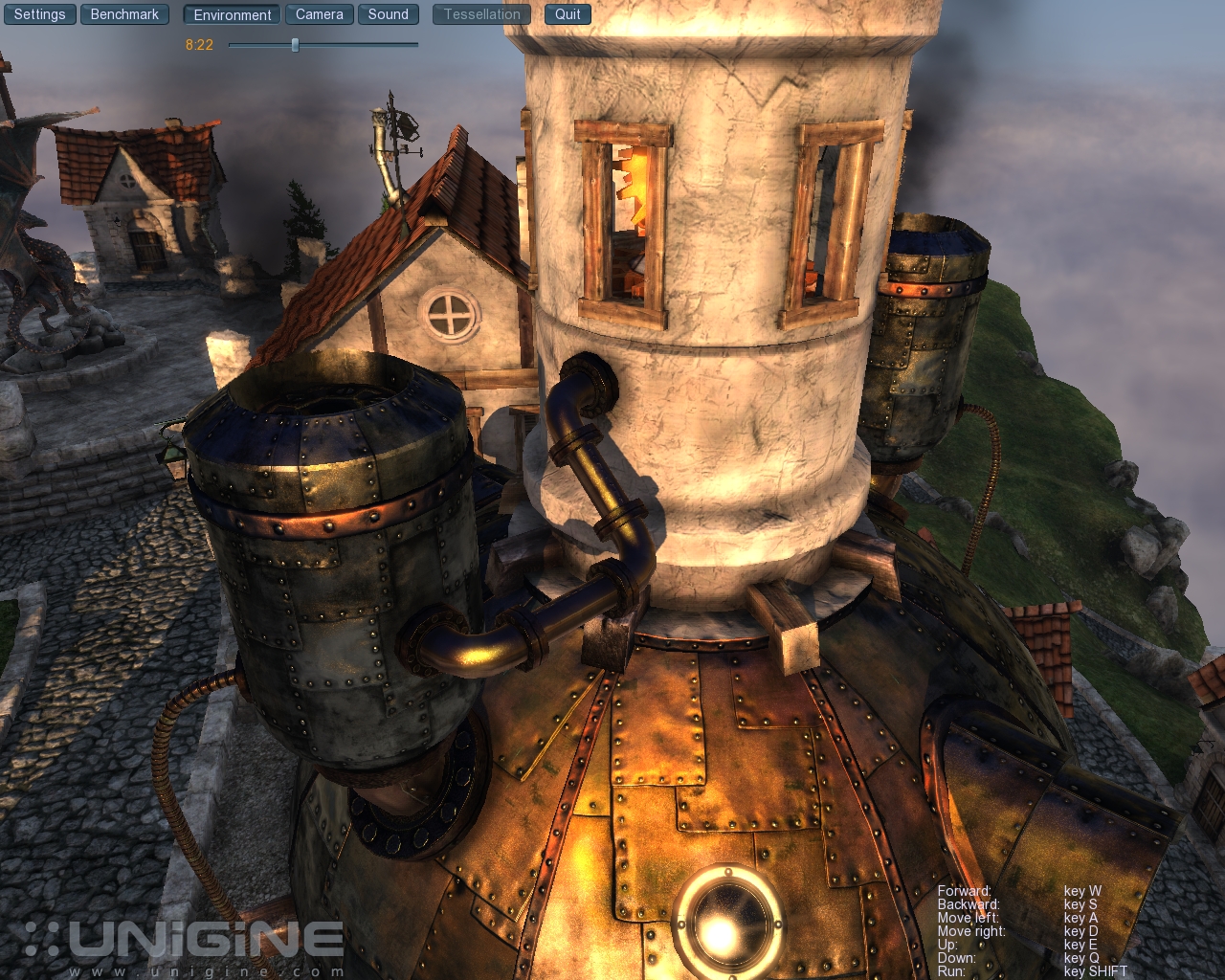 Seit langem war der Lüfter mal wieder auf 100% und die Temps jenseits der 85°C Marke Praktischerweise kann man mit der Free-camera selber durch den Benchmark navigieren und wahlweise einen day-night-cycle hinzuschalten- hat mich gleich an frühe Cryengine-Techdemos erinnert