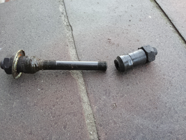 Irgendwie hat es das Kugellager bzw. Achse der Nabe zerlegt. Auf jeden Fall ist das Rad locker und es fallen Kügelchen heraus. Nachdem ich den Schnellspanner entfernt habe, ist mir folgendes entgegengekommen. Es ist in der Mitte gebrochen: