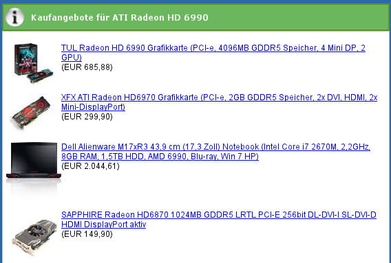 Ich habe eine (in meinen Augen) ganz nützliche Funktion in die Grafikchiprangliste Notebooks eingebaut: man bekommt nämlich nun angezeigt, in welchen Notebooks die jeweilige Grafikkarte eingebaut ist und kann direkt zum entsprechenden Shop gehen (und einkaufen). Somit kann man die Grafikchiprangliste nicht nur als technische Datenquelle, sondern auch als Einkaufsberater nutzen. Außerdem spart man sich die zusätzliche Suche in Google und diversen Online-Shops.
