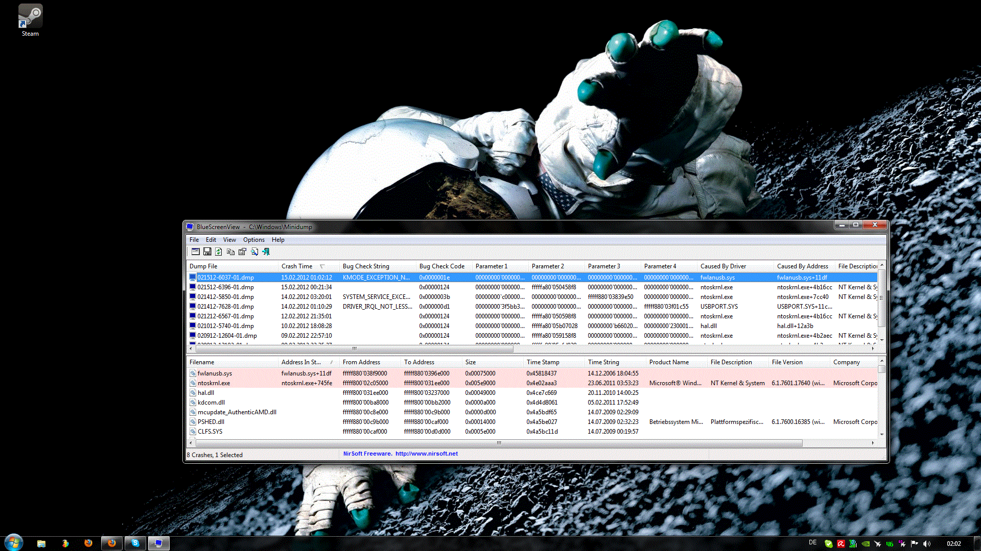 Da der Screenshot allerdings recht unpraktisch zu analysieren ist ("Bug Check String" z.B. würde ich gern komplett sehen) wärs klasse wenn du dein ganzes "C:\Windows\Minidump"-Verzeichnis in ein Archiv packen könntest (zip/rar/egal) und hier anhängst. Kopier den Ordner bzw. die Dateien dazu am besten erstmal auf den Desktop, da du als User im Windows-Ordner laut Windows nix zu suchen hast.