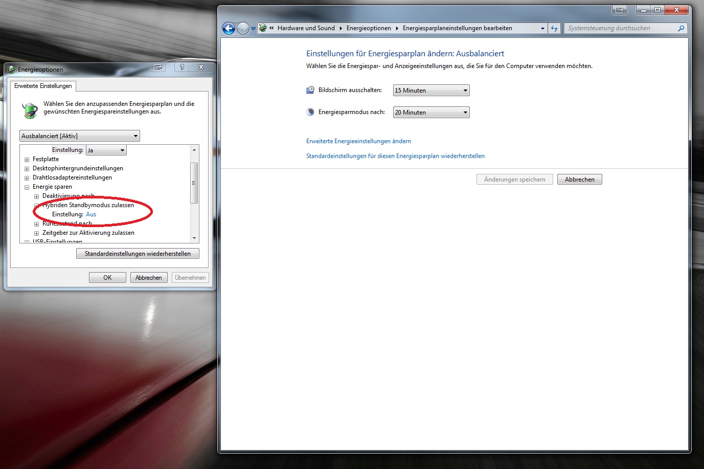 Mach mal die Einstellung für den hybriden Standbymodus aus. (Ist standardmäßig an)