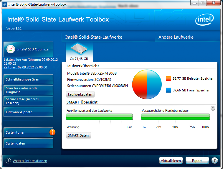 1. Die originale 320GB HDD (7mm von WD) musste einer X25-M mit 80GB von Intel weichen. Die SSD stammt aus 2010 und hat 3,19TB Hostwrites weg, dennoch 100% Lebenszeit.