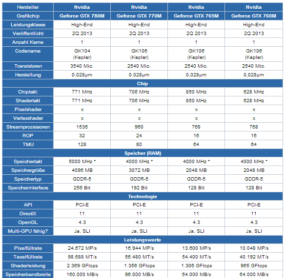 Notebook-Grafikchips: Geforce GTX 760M, 765M, 770M und 780M