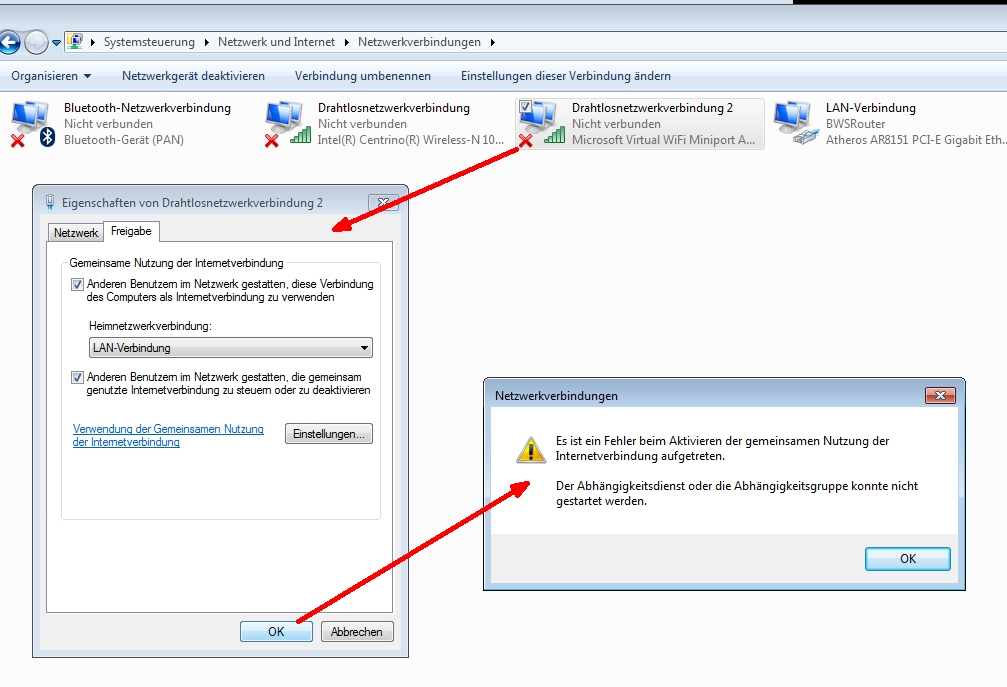 Ich habe schon Intel My Wifi und Virtual WiFi probiert, aber beide scheitern an der gleichen Fehlermeldung mit dem Abhängigkeitsdienst.