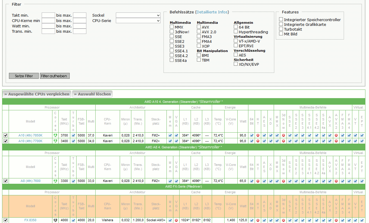 Die Prozessorlisten auf PC-Erfahrung.de existieren seit Gründung des Online-Portals und waren immer ein wichtiger Bestandteil. Leider fehlte bis heute die Möglichkeit, die technischen Daten einzelner Modelle direkt miteinander zu vergleichen, so dass man diesen Vergleich eigenständig durchführen musste. Aufgrund zahlreicher Nachfragen von Lesern und Mitgliedern von PC-Erfahrung.de wurde die gewünschte Vergleichsfunktion nun endlich etabliert.