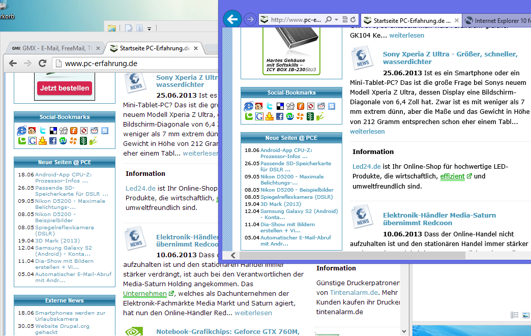 Vergleich Google Chrome (li) und IE 10 (re)