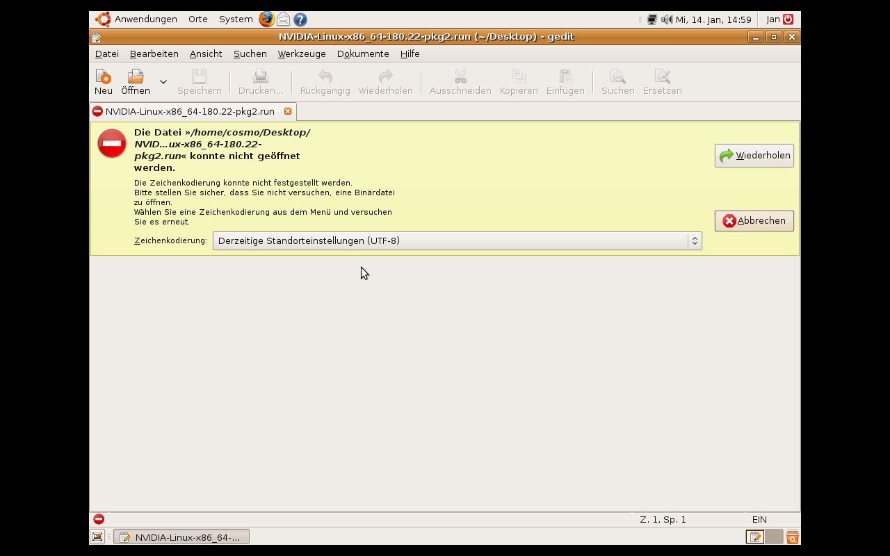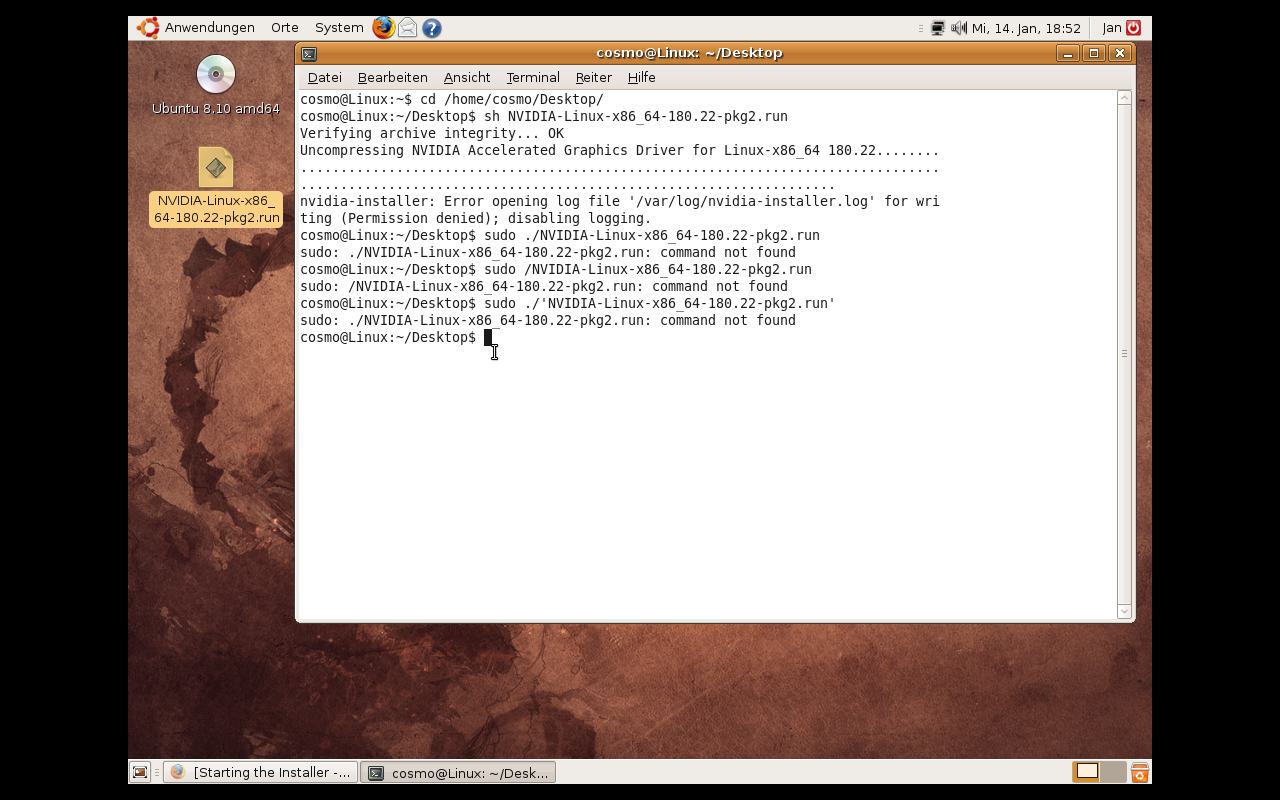 habe mir gerade Ubuntu 64bit installiert und habe den Treiber für meine 9400M von nvidia.de runtergeladen. Aber wenn ich jetzt auf die Datei klicke kommt diese Fehlermeldung im Anhang.