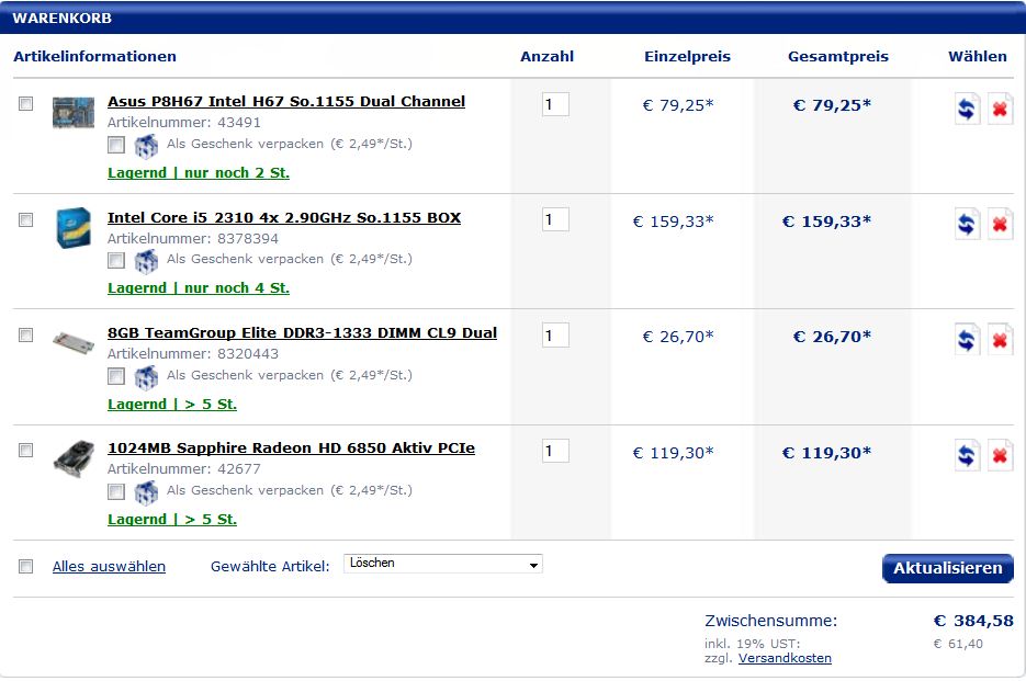 ich hab mir jetzt nochmal 2x2 GB RAM geleistet für 30 € und die Saphire HD 6850 für 118 Euronen ergattert.