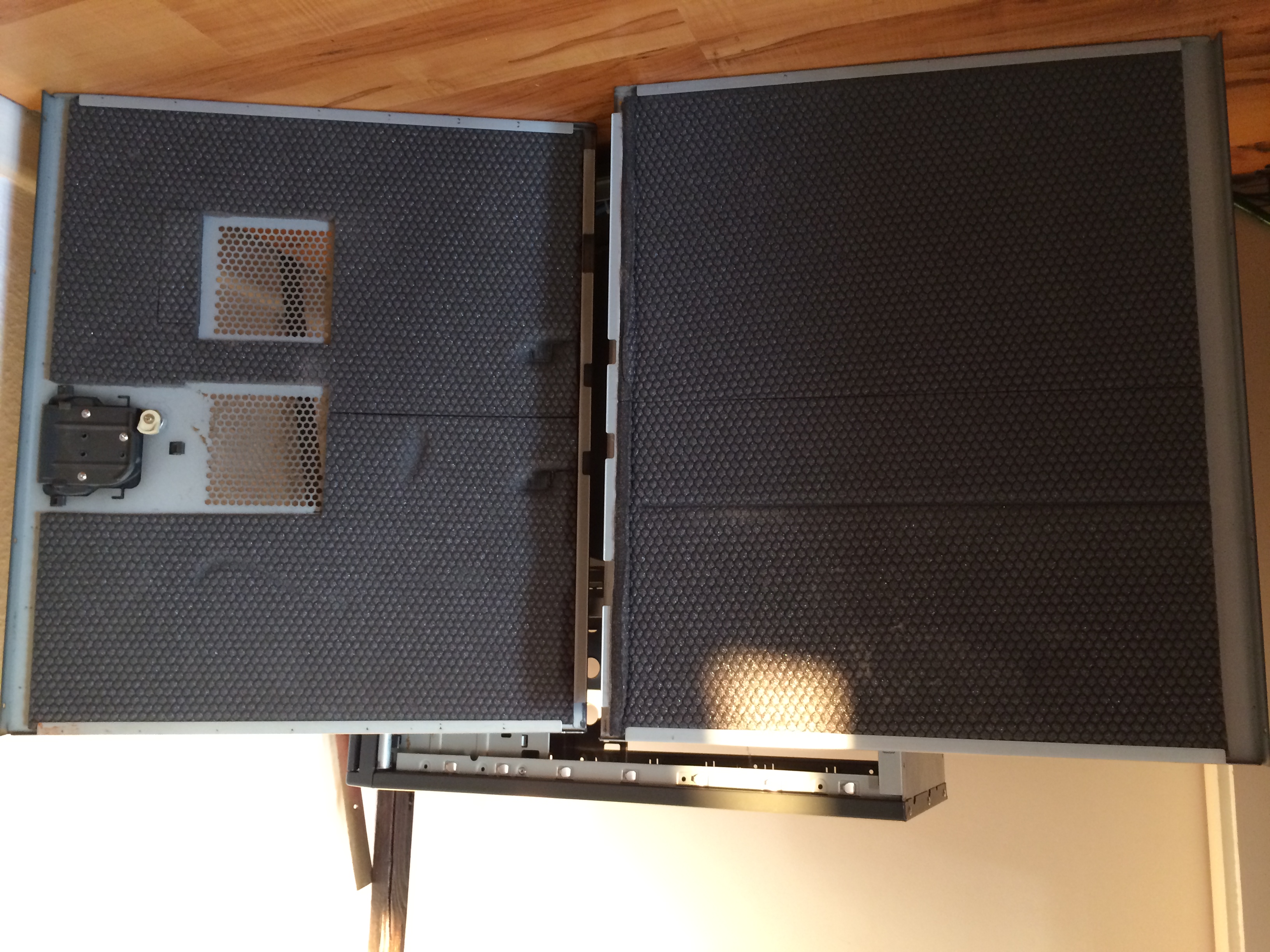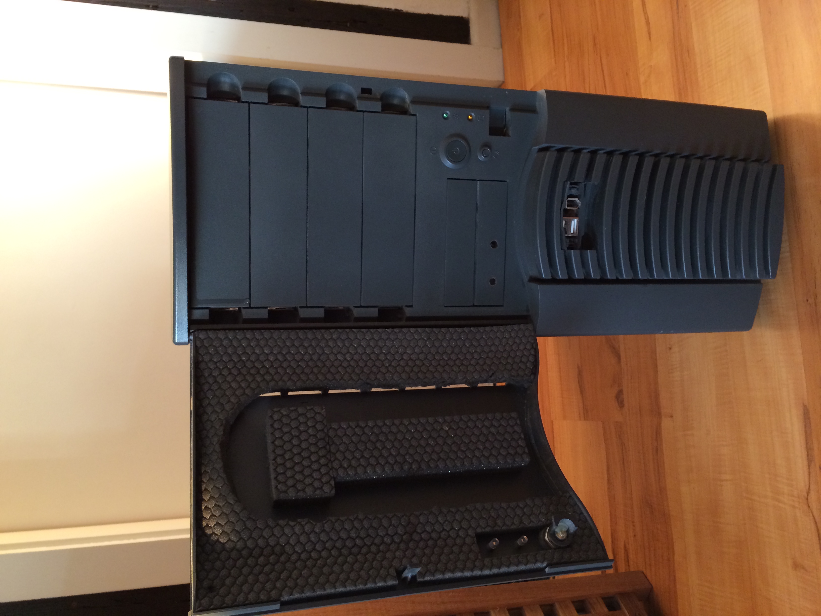 Umzüge und ein paar Basteleien haben ihre Spuren hinterlassen. So hat das Gehäuse über die Zeit ein paar Kratzer abgekommen und dan der Frontklappe fehlt ein Teil der Dämmung, was aber subjektiv keinen Unterschied in der Lautstärke zur Folge hatte. Den Gesamtzustand erkennt man auf den Bildern