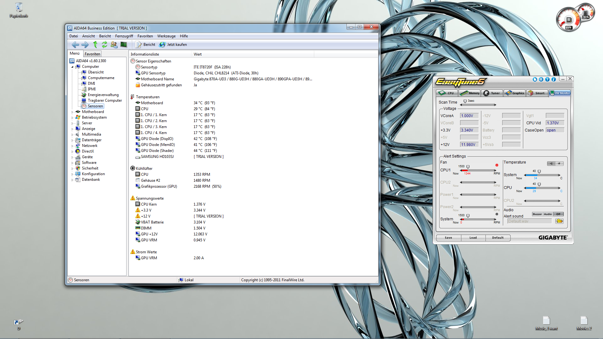 Edit2: Hier mal Screenshots. Der nach der Stunde Far Cry 2 mit allem max der zweite im Leerlauf. Wie man darauf erkennen kann sieht man bei Easy Tune 6 was ich damit meinte das der System Fan irgendwie nciht erkkant wird da keine rpm da ist jedoch drehen sich alle lüfter. Und bei Aida sieht manauch nur einen Extra lüfter. Wo sind die anderen?