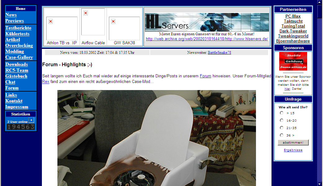 Diese Webseite war mal in den anfänglichen Zeiten des Overclocking-Booms von Prozessoren, Grafikkarten & Co. eine interessante Anlaufstelle, wenn man wissen wollte, wie man seinen Prozessor übertaktet. Ich werde mich wahrscheinlich immer daran erinnern, wie jemand seinen Athlon Thunderbird 1000 MHz auf über 1400 MHz übertaktet hat. Damit dies alles auch funktioniert, hat er seinen offenen PC im Winter auf die Fensterbank gestellt. Das war so um 2002...