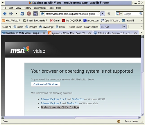 Auf der MSN-Website steht es schriftlich: Anwender eines MAC-PCs sollen den Mozilla Firefox verwenden, um im WWW zu surfen. Seit 2006 wird die Internet Explorer-Engine für Mac OS X nicht mehr supported und mittlerweile deutet Microsoft explizit darauf hin, dass man unter dem Mac OX X Betriebssystem doch lieber den Mozilla Firefox 2 verwenden solle: