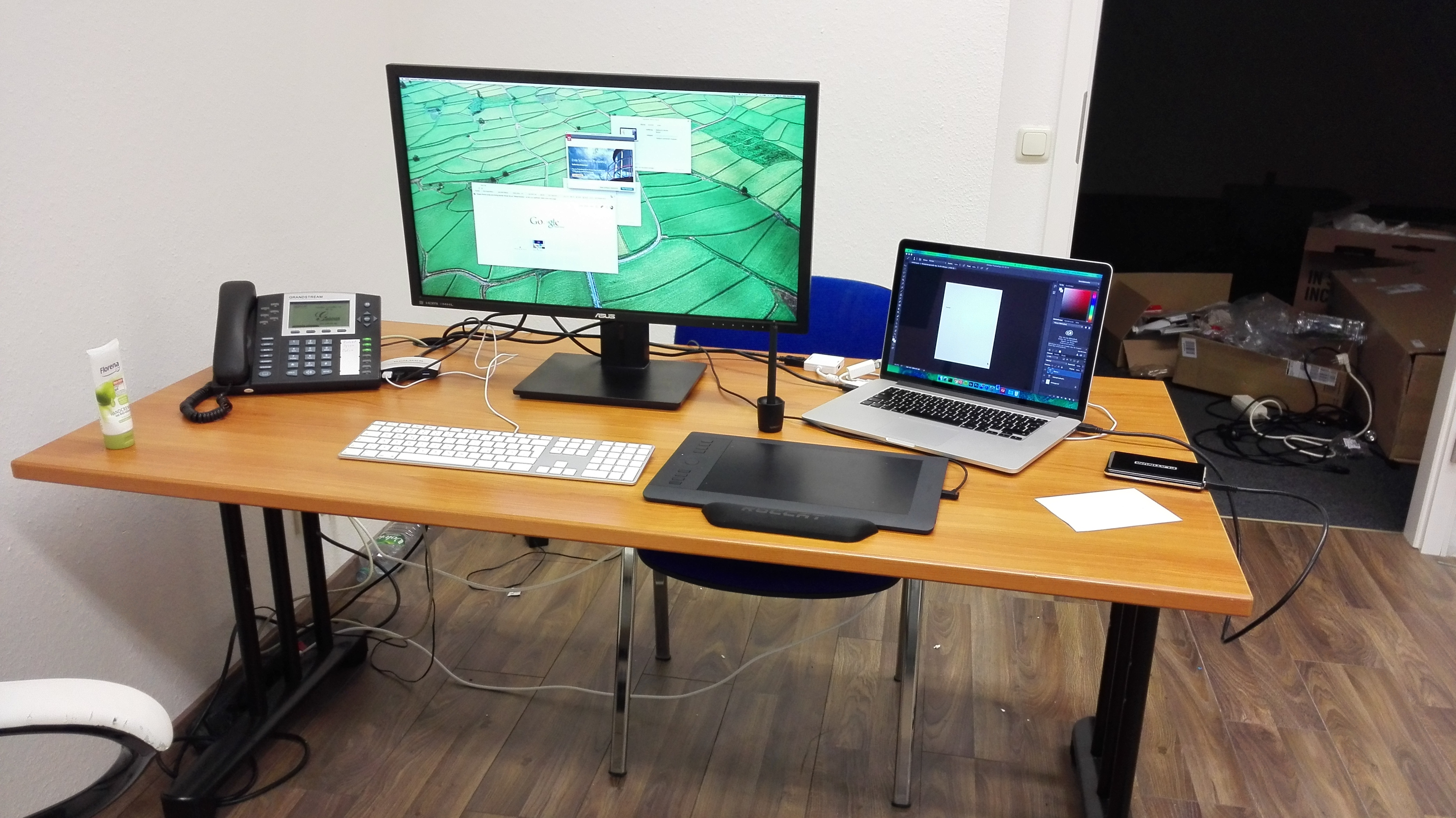 Ein winziges Macbook als Hauptrechner? Ist das nicht zu klein. Und wozu dann der schöne Dell-Monitor?